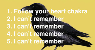 The font is the key. Helvetica is meant to be a font clearly read and universally understood, devoid of flourish or ego. Likewise the raven or crow, a black bird, devoid of beauty, a pure Mercuric messenger of the Id. The message is to follow your heart. Always a good message, but I think, one especially important right now.