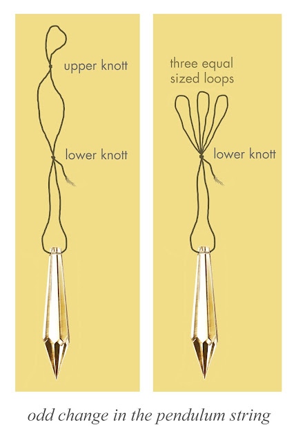 For a time it was setting unused on a shelf in the closet. There was a day when Andrea asked me, “Did you do anything to the the string on my pendulum?” I said no and asked her what had happened. She showed me the string and it had been re-tied with three very short loops.