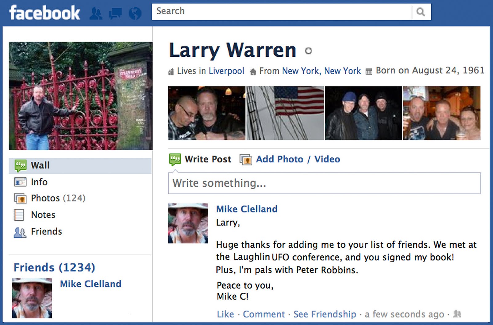 More weirdness with UFOs and the number 1234 involving one of my heroes, Larry Warren. Just a few minutes ago Larry added me to his list of friends on facebook. He plays a central role in the Bentwaters case from 1980, perhaps the single most well documented UFO case in history. He also wrote the book LEFT AT EAST GATE, along with Peter Robbins, about the Rendalsham Forest incident.