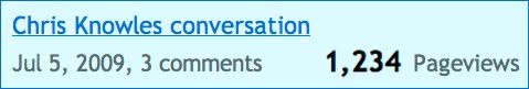I occasionally check my blog stats, and this number jumped out at me. This is the total number of page hits from a post way back in 2009. This was an excellent audio interview with Christopher Knowles (of The Secret Sun). Curiously, this was the very first interview I did in my role as pod-caster. It seems funny that this post would chime in at 1234 right at the moment I checked in. I see it as a less than subtle nudge to do more interviews!