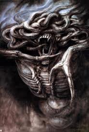 I was suddenly experiencing a frenetic slide-show of freakish images, it was taking place in my heightened dream-state. The images were like something out of a gruesome set of heavy metal album covers, each image was like a finished piece of surreal artwork. They were bloody and perverse. These highly stylized snapshots looked like a H.R. Giger nightmare. Each hideous image would last less than a second, and then the next would appear, and the next, and the next.