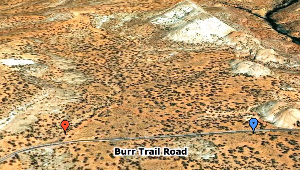We had been to the multi-day UFO conference in Phoenix, and we were taking the scenic route to my home in Idaho. We had been driving and hiking throughout the day, and we set out our sleeping bags just a little bit after sunset. Instead of getting a hotel room, we chose to camp just off the (very beautiful) Burr Trail Road, about 8 miles east of the little town of Boulder Utah. The map of Utah (below) shows our location with a blue marker.